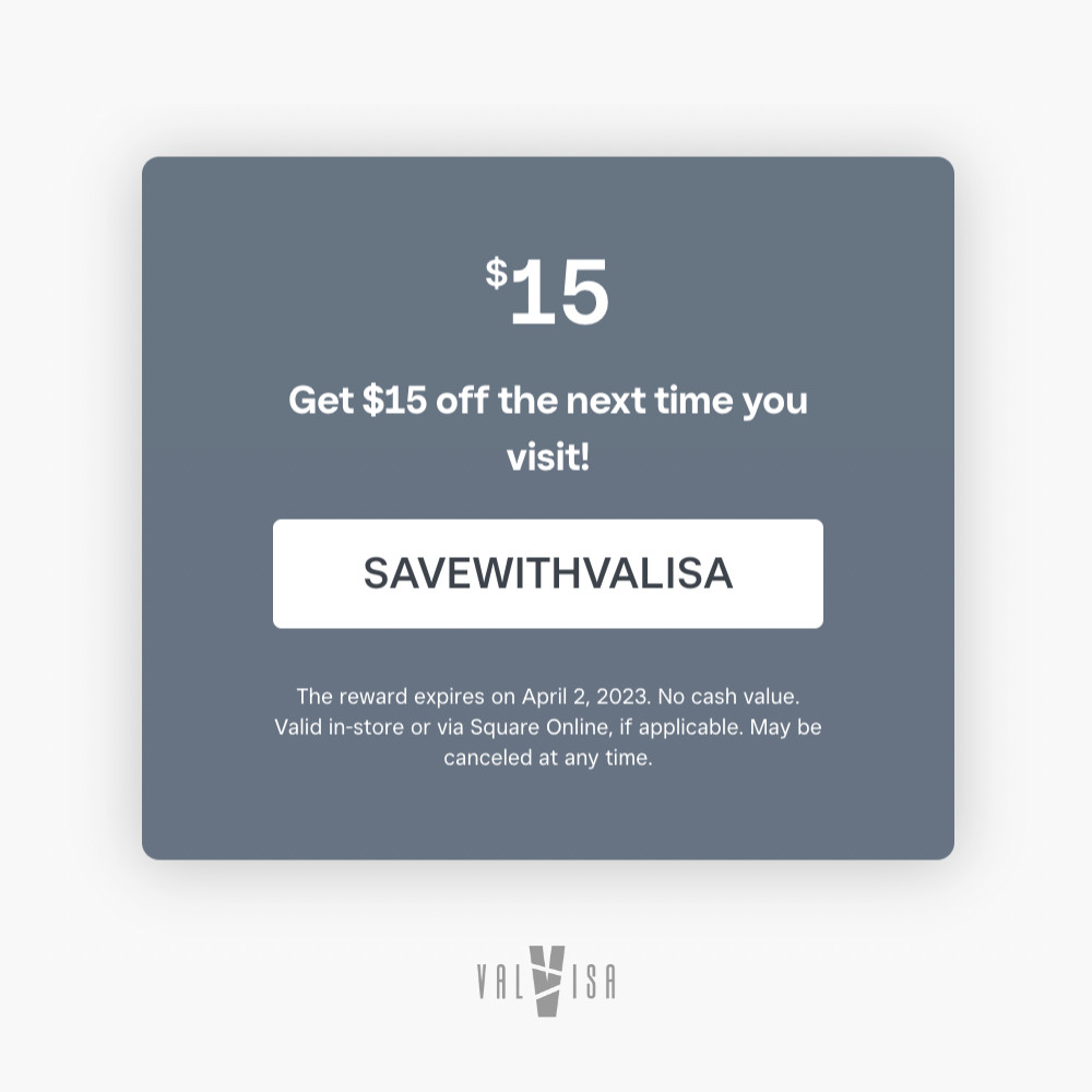 We hope you are enjoying your recent purchase, and we would like to offer you $15 off your next visit with us as a token of our appreciation. Simply use the code "SAVEWITHVALISA" at checkout to redeem this offer. This coupon code is valid for this weekend and will expire on Sunday, April 2nd.